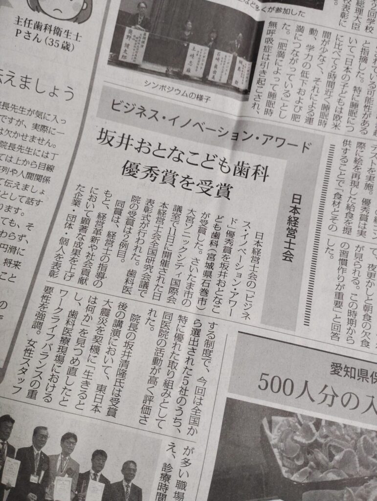 今年度の日本経営士会のビジネスイノベーションアワードで優秀賞を受賞した坂井おとなこども歯科さんの記事が、日本歯科新聞に掲載されました。